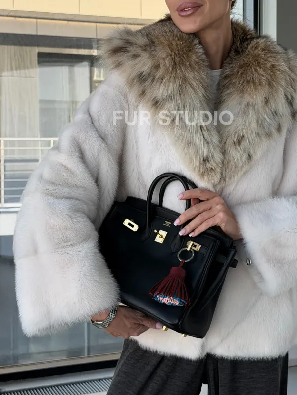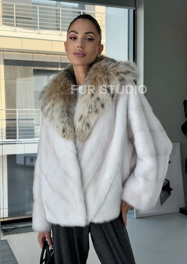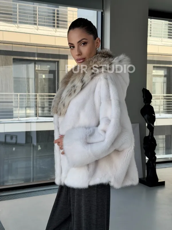 Белое норковое манто с капюшоном из меха рыси – выбор девушек, которые готовы экспериментировать. Летучка сделает ваш образ легким и воздушным. Необычный цвет напомнит о лете и освежит ваш стиль. Нежный мех бережно согреет владелицу в любые холода. Шикарный капюшон из рыси позаботится, чтобы волосы были в тепле.