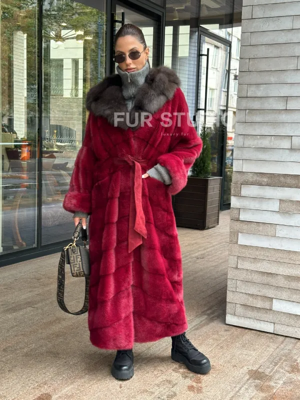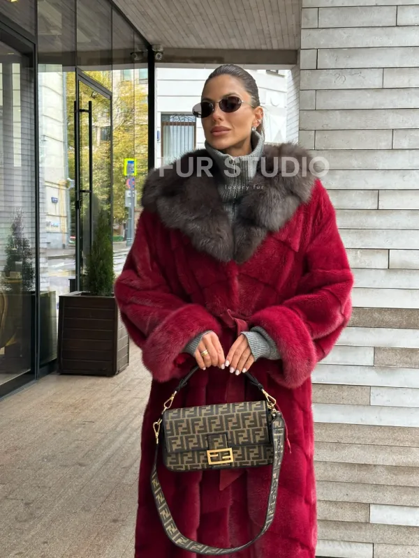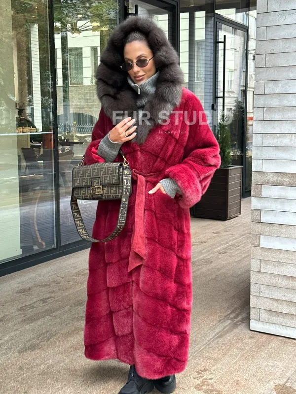 Мех данной шубы аукционная норка, цвет бордовый. Предлагается в размерах от 40 до 50. Длина модели 125-130 см, что выгодно подчеркивает фигуру девушек. Эта модель идеально подойдет для девушек и женщин, предпочитающих роскошные натуральные меха.