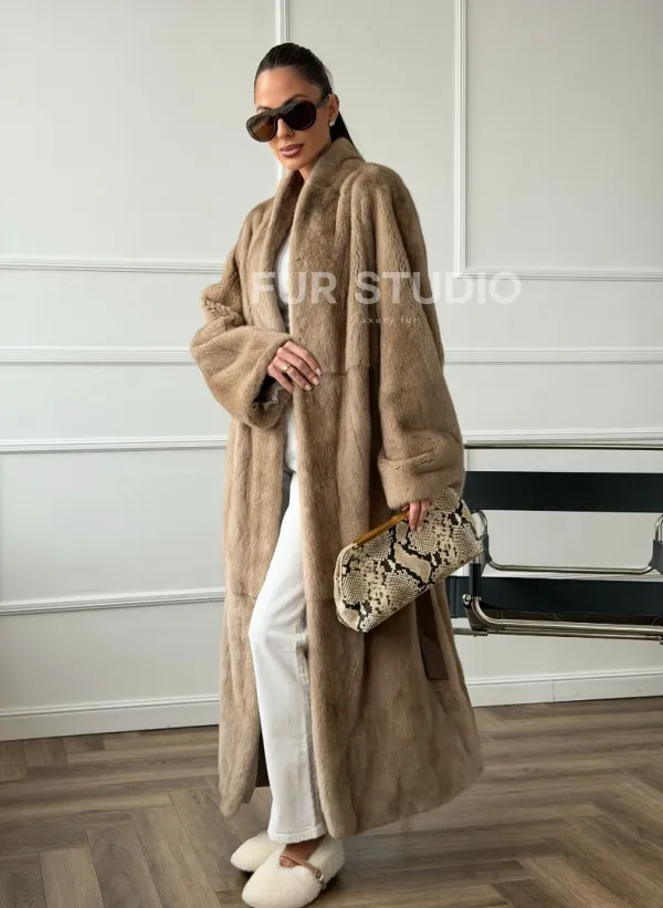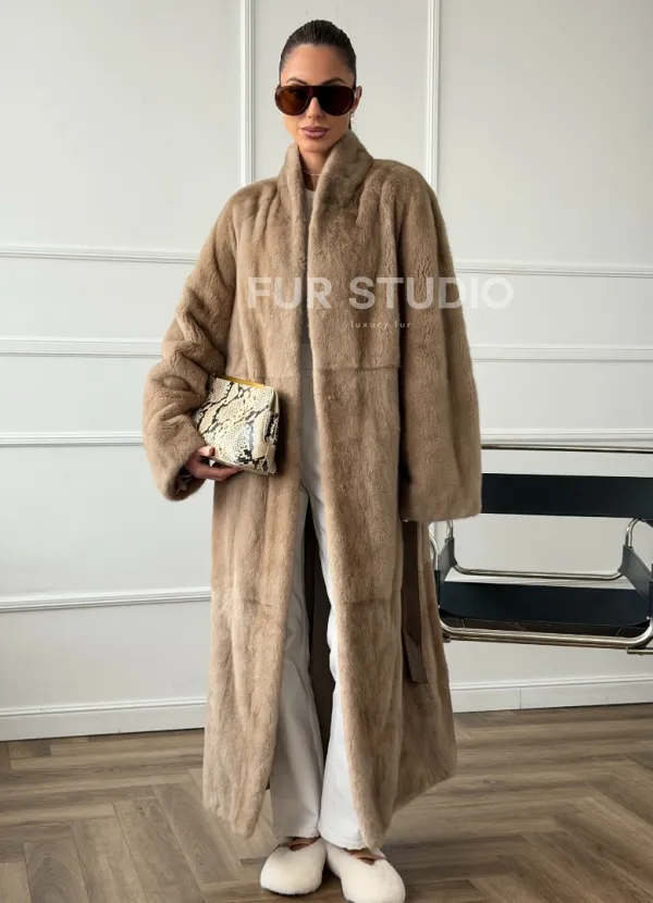 Мех данной шубы аукционная норка, цвет бежевый. Предлагается в размерах от 42 до 48. Длина модели 120-125 см , что выгодно подчеркивает фигуру девушек. Эта модель идеально подойдет для девушек и женщин, предпочитающих роскошные натуральные меха.