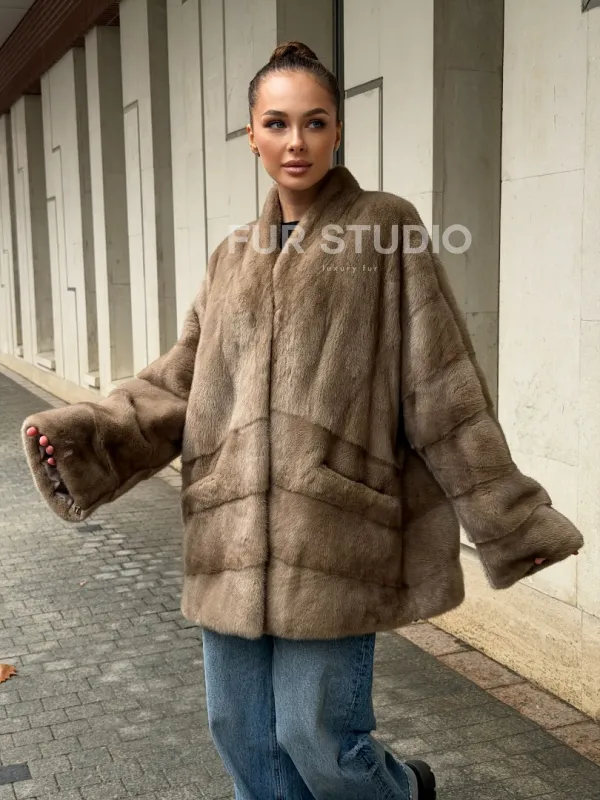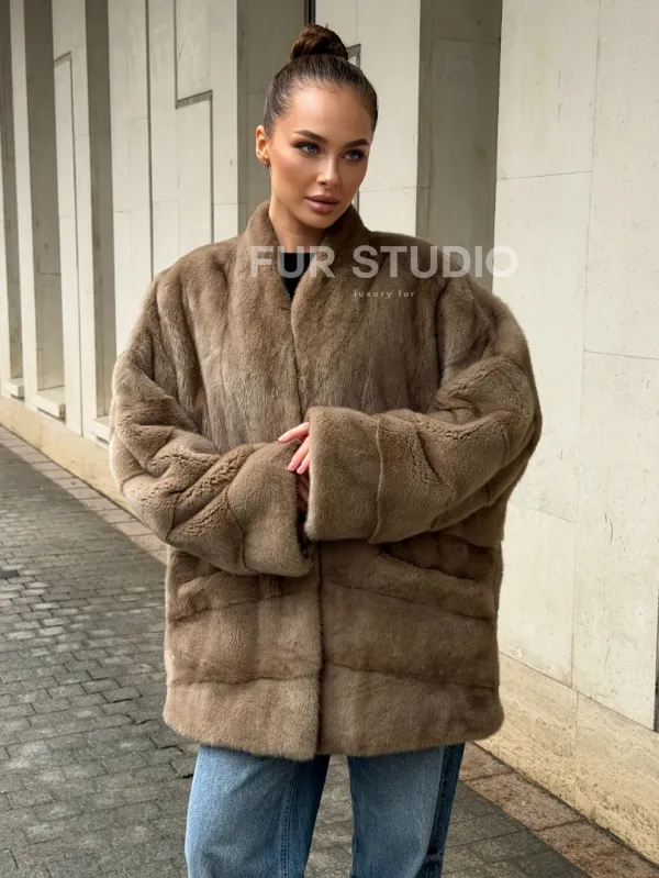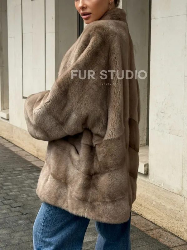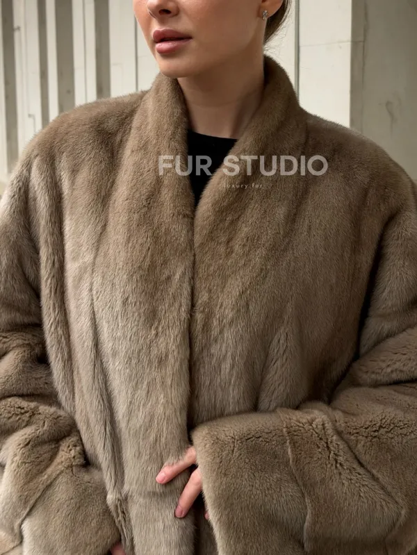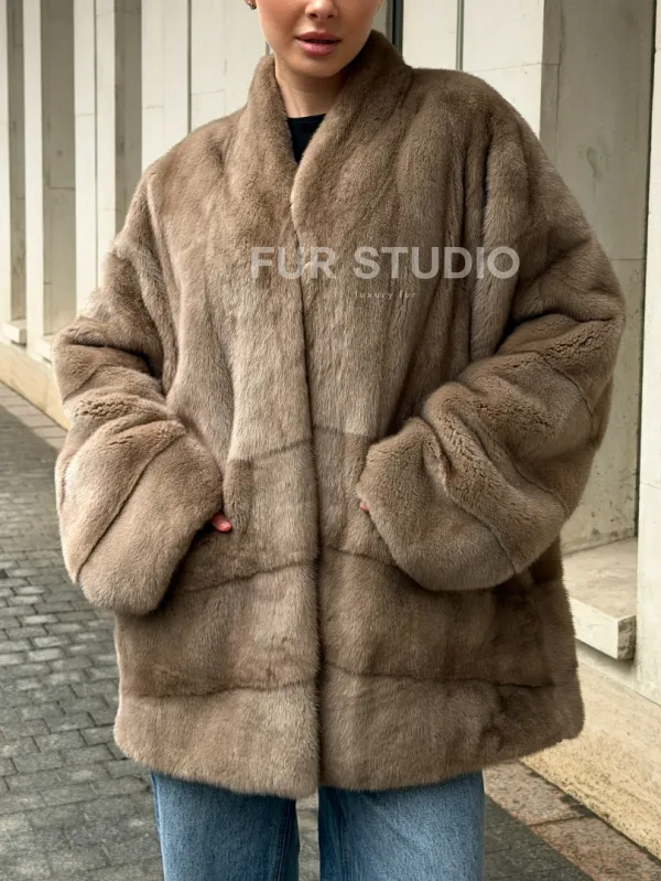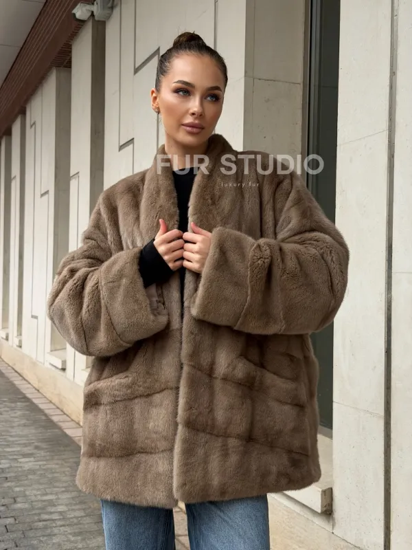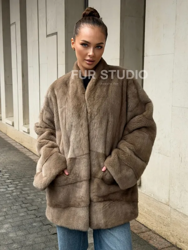 Норковый полушубок пастель V-образный воротник 102566
