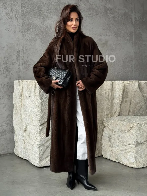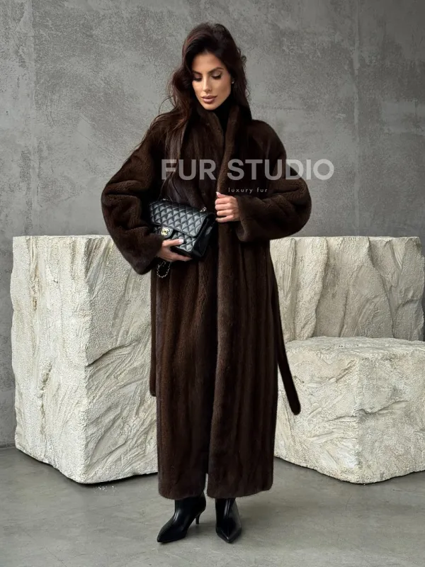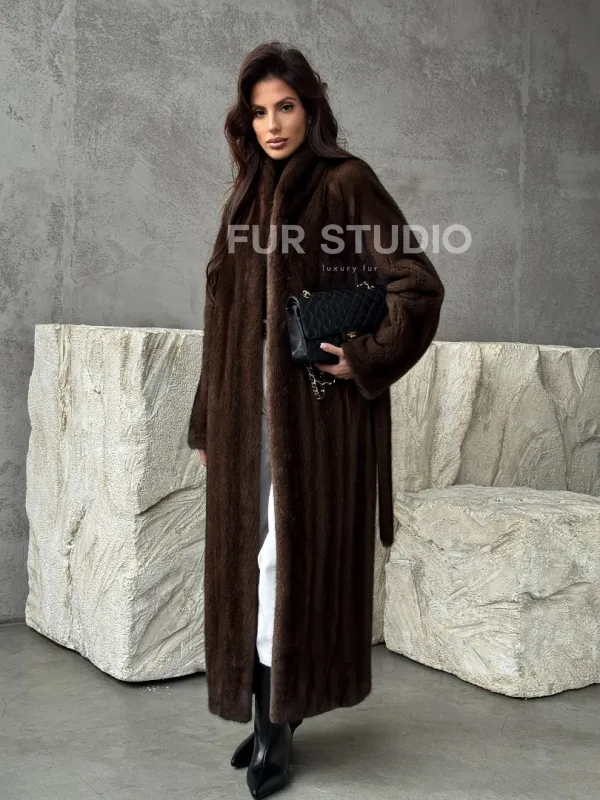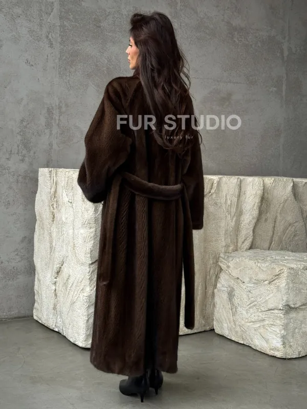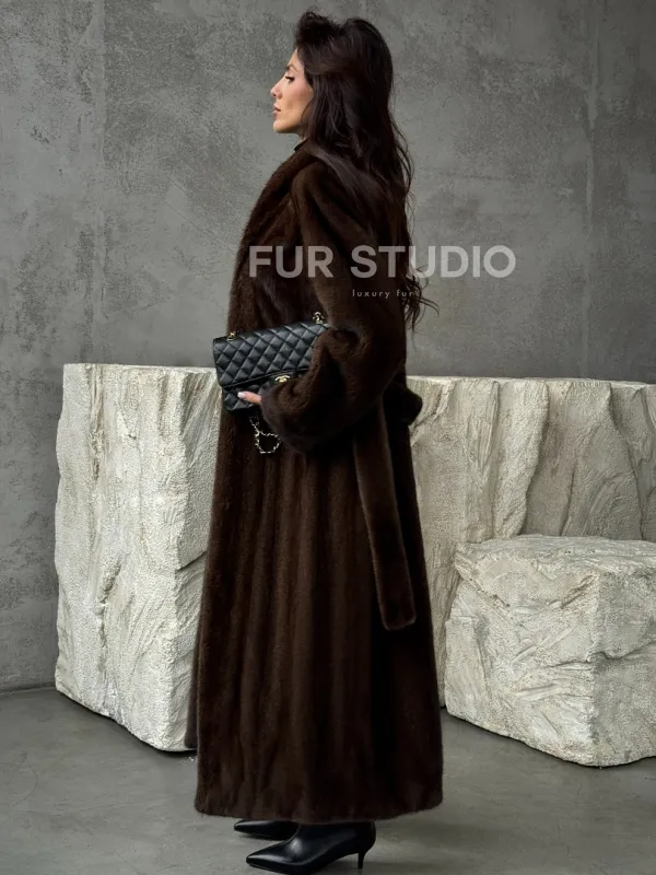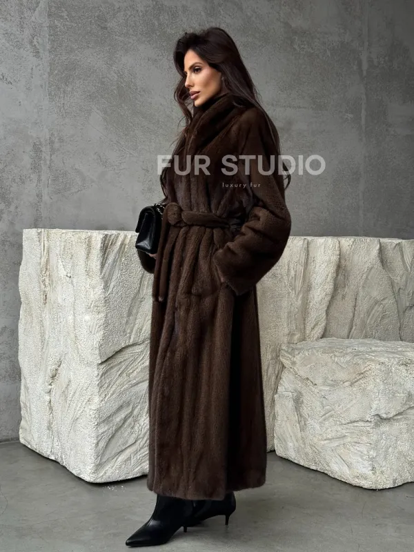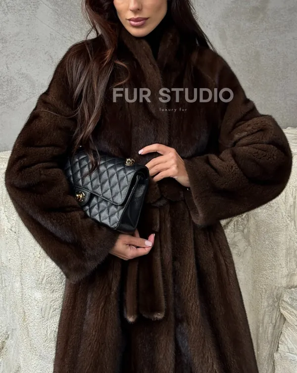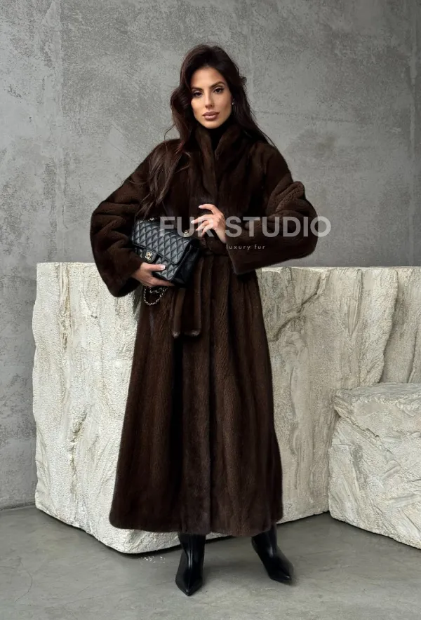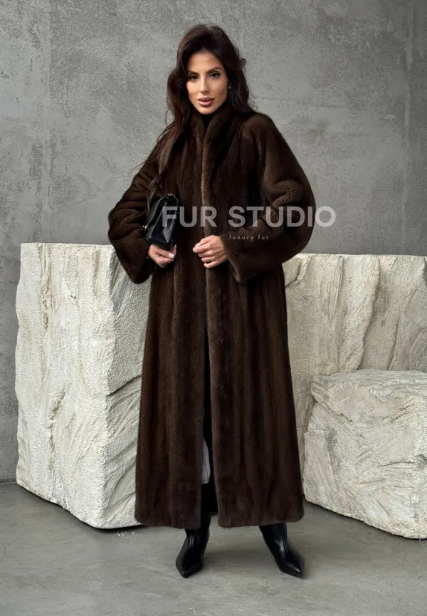 Мех данной шубы аукционная норка, цвет коричневый. Предлагается в размерах от 42 до 50. Длина модели 125-130 см, что выгодно подчеркивает фигуру девушек. Эта модель идеально подойдет для девушек и женщин, предпочитающих роскошные натуральные меха.