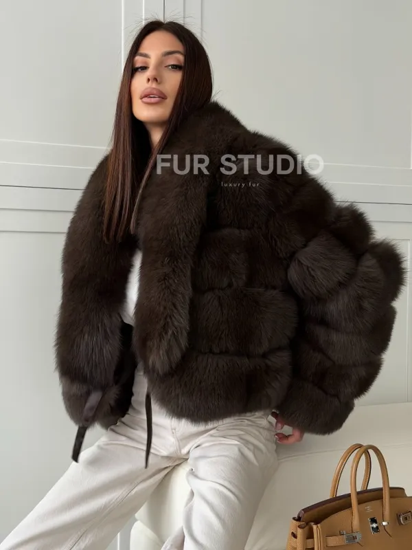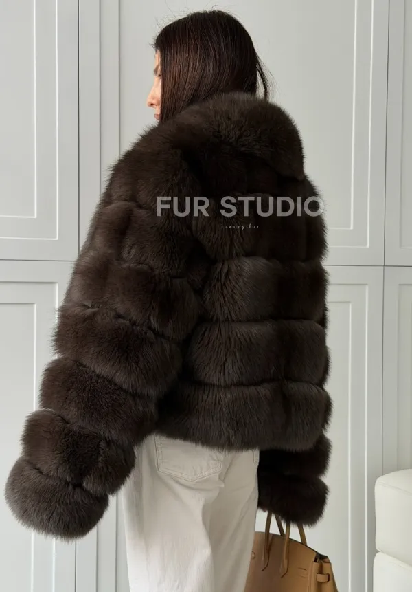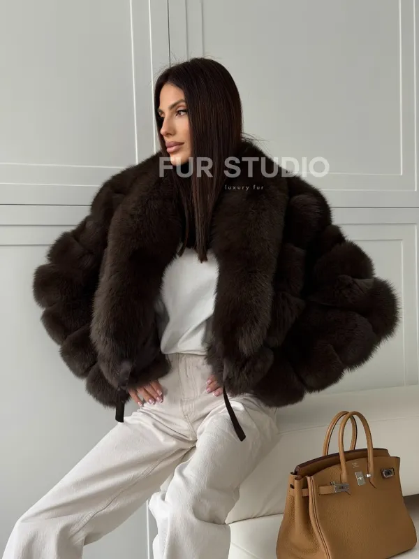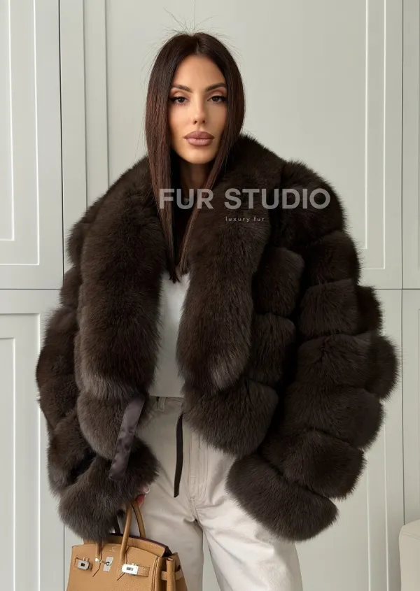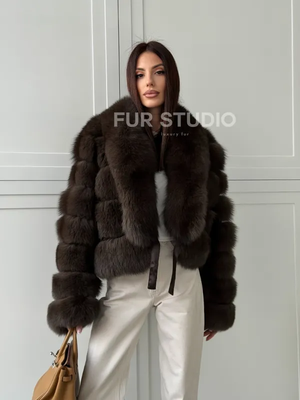 Мех данной шубы финский песец, цвет коричневый. Предлагается в размерах от 42 до 48. Длина модели 50-55 см, что выгодно подчеркивает фигуру девушек. Эта модель идеально подойдет для девушек и женщин, предпочитающих роскошные натуральные меха.