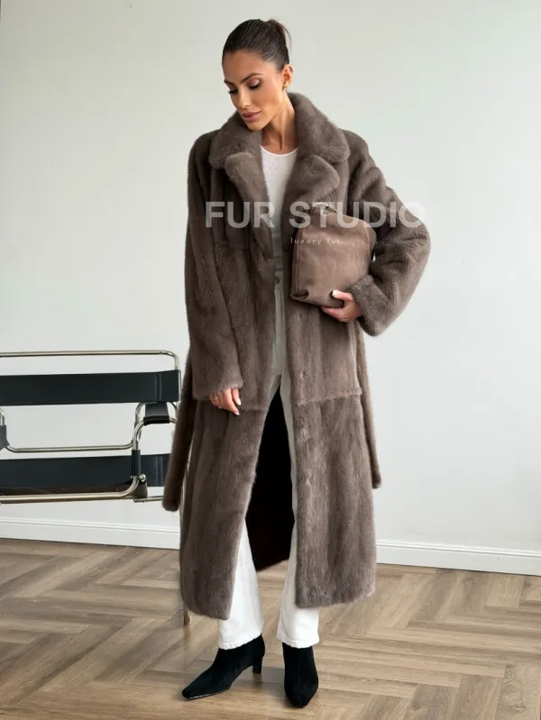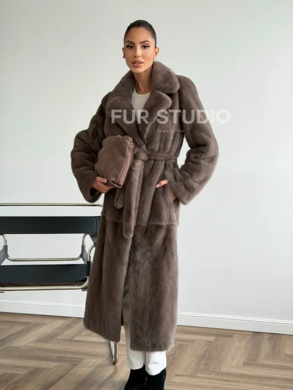 Прямая норковая шуба с поясом 102651