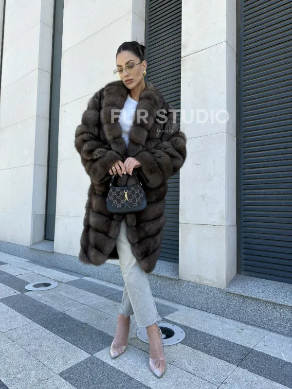 Легкая и стильная шуба из темного меха баргузинского соболя в длине миди — выбор деловых и активных женщин. Эта модель отлично подходит тем, кто ездит за рулем, но также и для любительниц прогуливаться пешком в любую погоду.