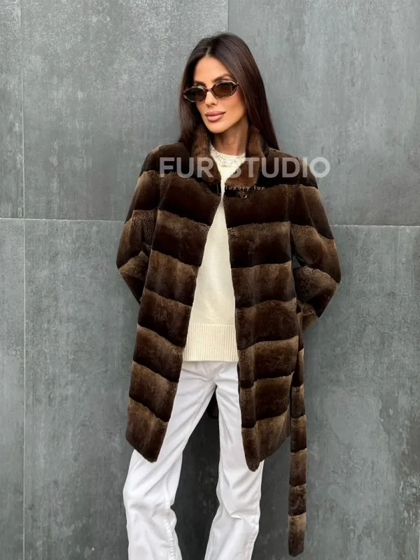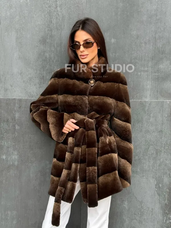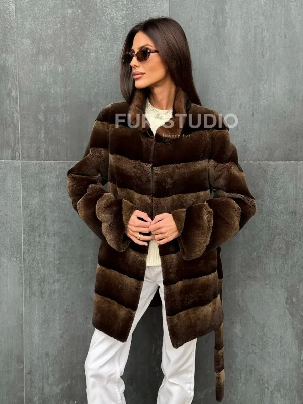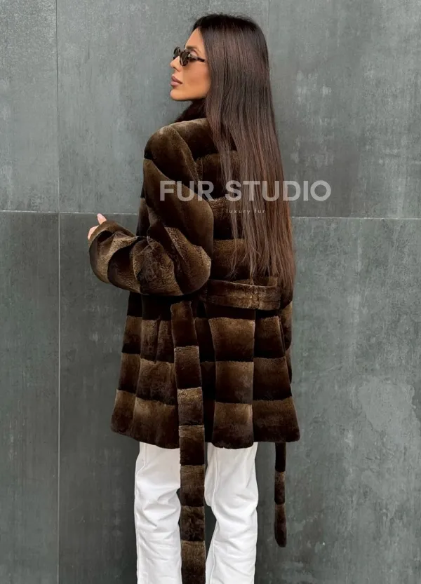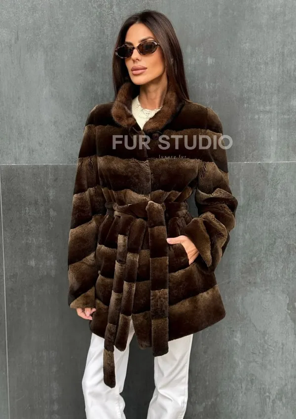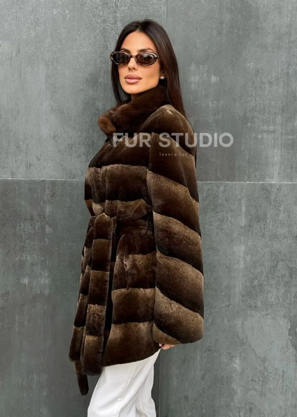 Мех данной шубы кролик рекс , цвет коричневый. Предлагается в размерах от 40 до 42. Длина модели 75-80 см, что выгодно подчеркивает фигуру девушек. Эта модель идеально подойдет для девушек и женщин, предпочитающих роскошные натуральные меха.