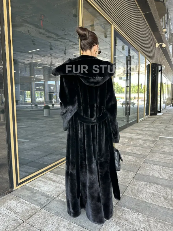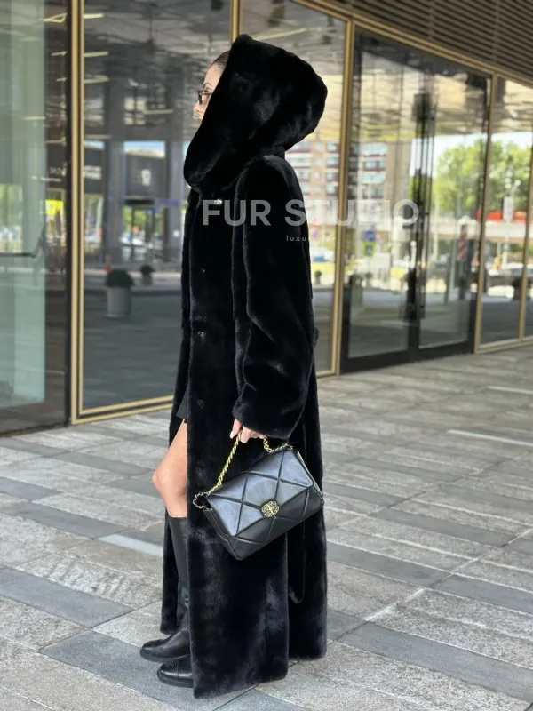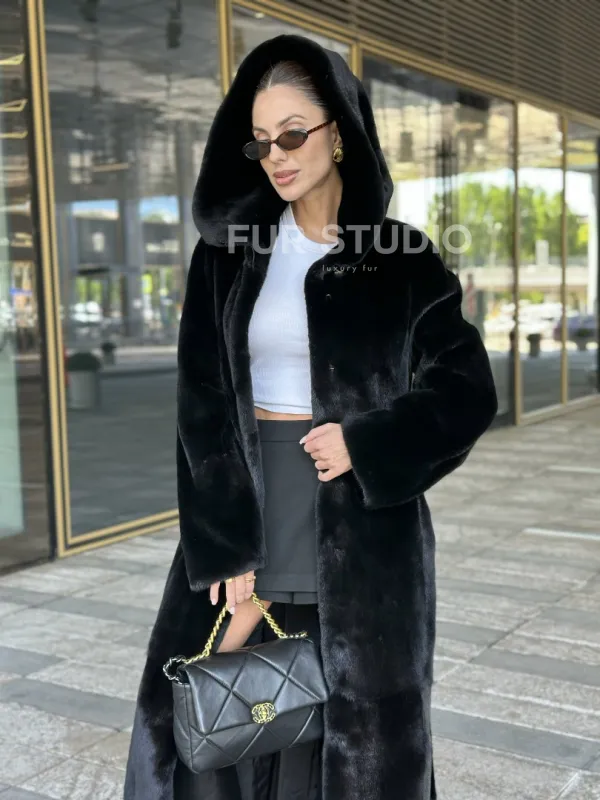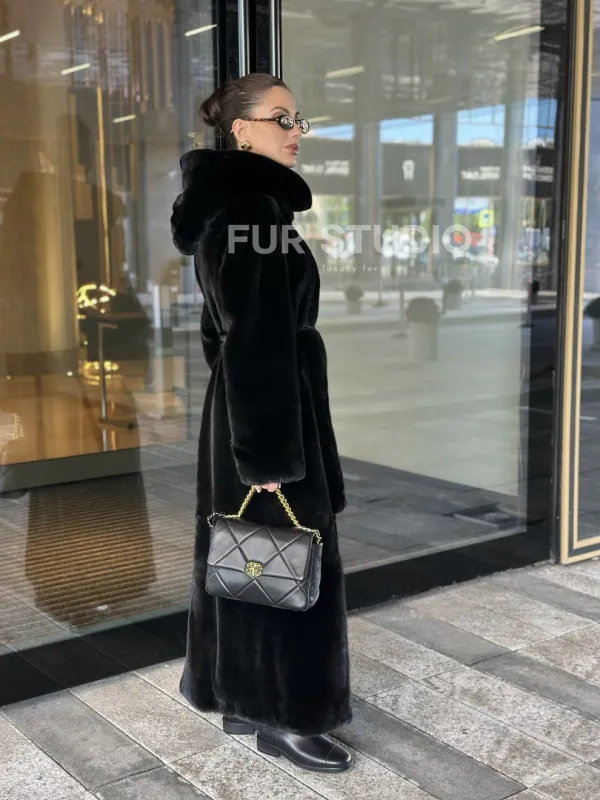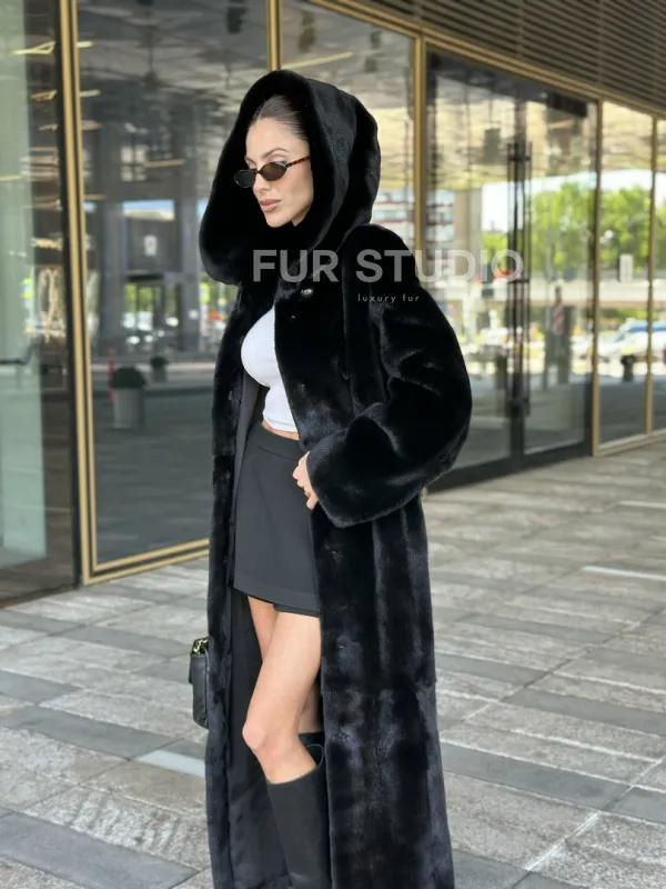 Удлиненная шуба из норки BLACKGLAMA с капюшоном доступна для покупки в нашем шоуруме Furs Studio в . У нас так же есть доставка во все города России. Добавьте немного роскоши в свой гардероб с этой шубой, которая будет служить вам многие годы.