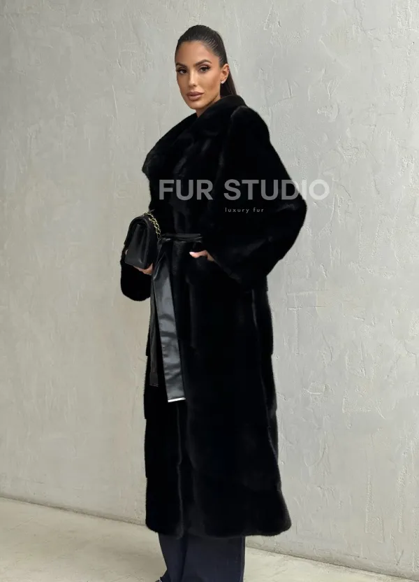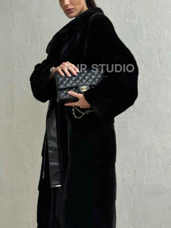 Удлиненная черная шуба с поясом из скандинавской норки – отличное решение для стильных и уверенных женщин, которые знают что хотят. Модель выглядит роскошно, и в ней вы будете собирать восхищенные взгляды. Комфортная длина бережно защитит владелицу в любую непогоду. Меховой пояс выгодно очертит талию. Прямой крой поможет скрыть недостатки фигуры. Изделие подходит девушкам любого возраста и типа фигуры.