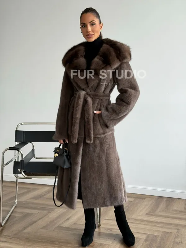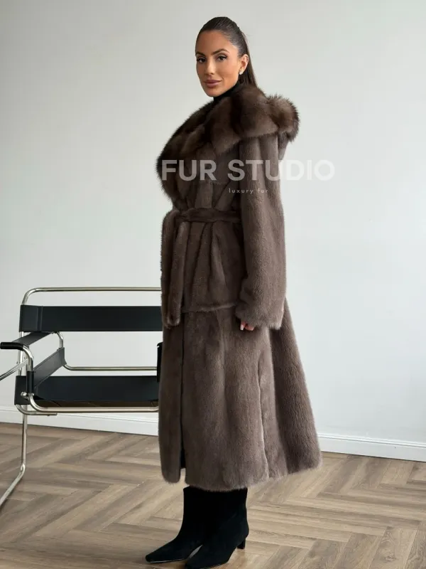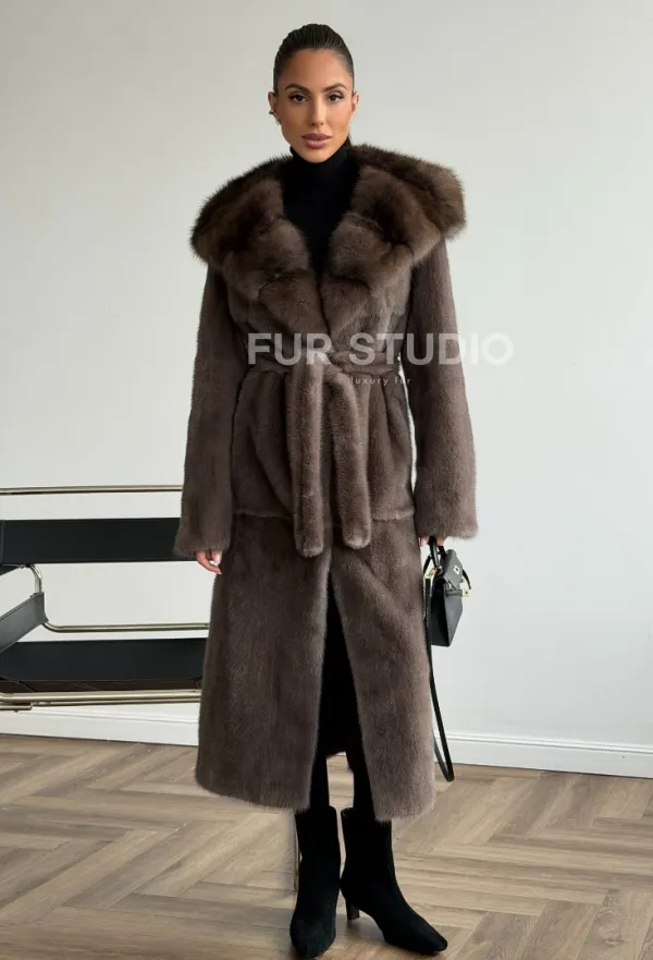 Мех данной шубы аукционная норка, цвет коричневый. Предлагается в размерах от 42 до 52. Длина модели 115-120 см, что выгодно подчеркивает фигуру девушек. Эта модель идеально подойдет для девушек и женщин, предпочитающих роскошные натуральные меха.