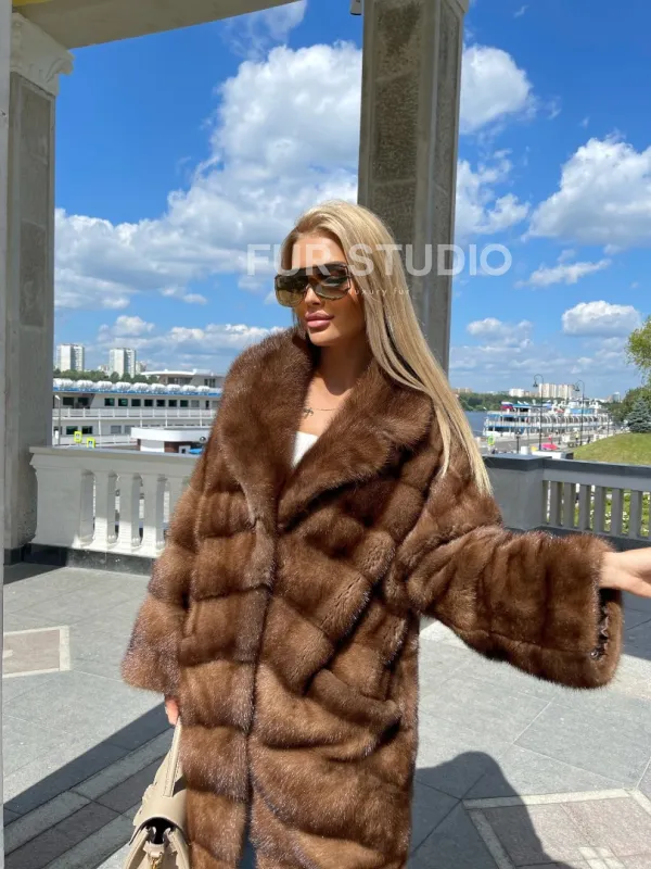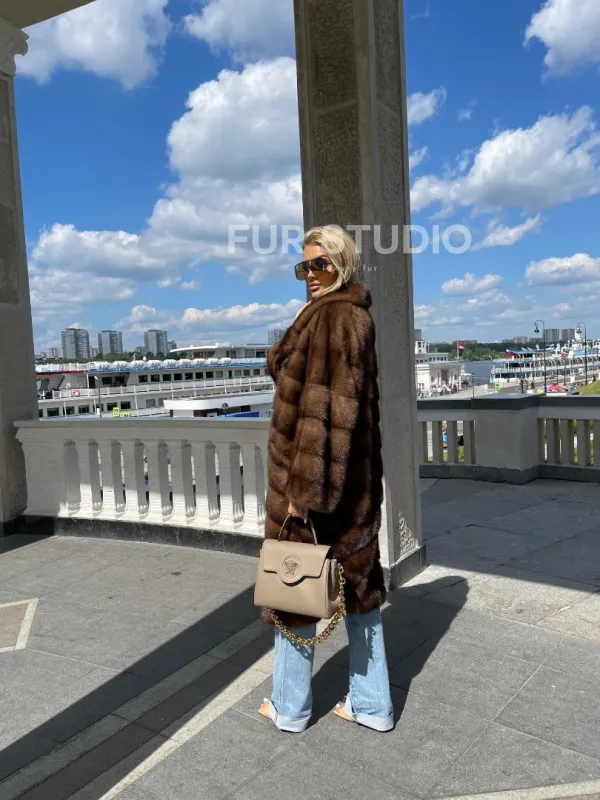 Модель гармонично сочетается с любым гардеробом от базового до вечерних туалетов. Длина изделия позволяет носить короткие вещи, что очень удобно в холодное время года. Прямой крой зрительно увеличит рост и скроет недостатки фигуры. Широкие рукава подчеркнут изящество кистей и не сковывают движение рук. Добавьте в образ статусную сумочку, и вы будете выглядеть дорого и изысканно. Купить удлиненную норковую шубу в цвете соболь могут женщины, которые знают толк в моде.